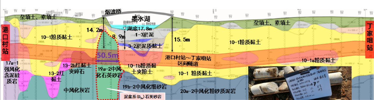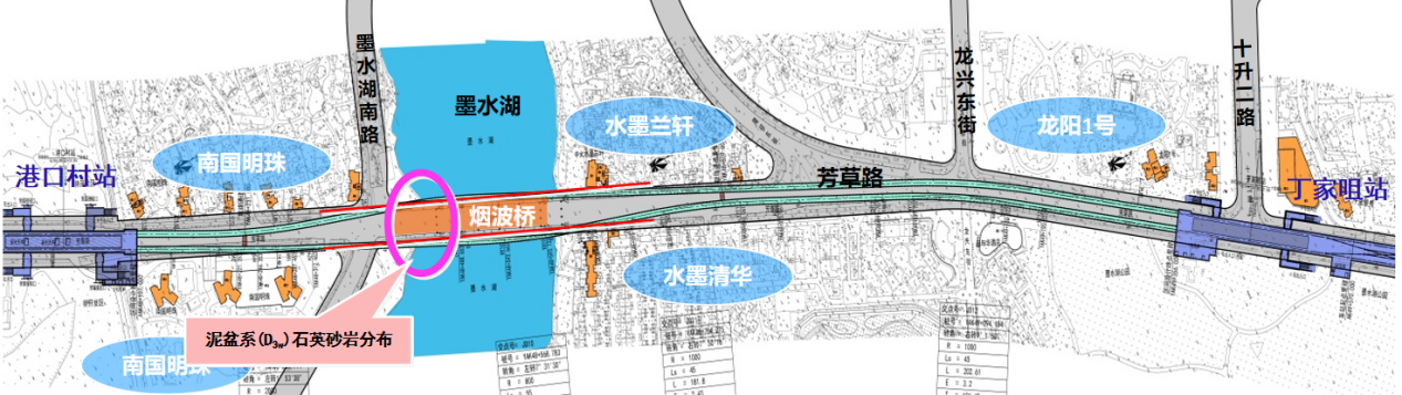 ? ? 超硬巖層、超近下穿。本項目設計范圍中的港口村站~丁家咀站區(qū)間隧道長約1242m,采用盾構法施工,管片直徑6.2m,需下穿墨水湖與煙波橋,該巖層號稱“磨刀石”,為武漢地鐵建設史上的最硬巖層。