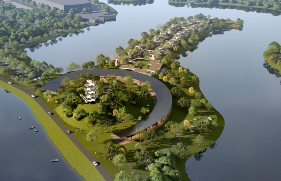 ? ? 濕地創(chuàng)展空間應(yīng)用了半島城市設(shè)計概念,與永久會址交相呼應(yīng)。建筑設(shè)計創(chuàng)意靈感來自桐湖的漁舟,猶如幾條小船從湖畔伸向水面,兼具觀展和觀景功能,將國際小鎮(zhèn)的濕地特色體現(xiàn)得淋漓盡致。濕地創(chuàng)展藝術(shù)空間為文化藝術(shù)展示展覽、交流及研學空間。