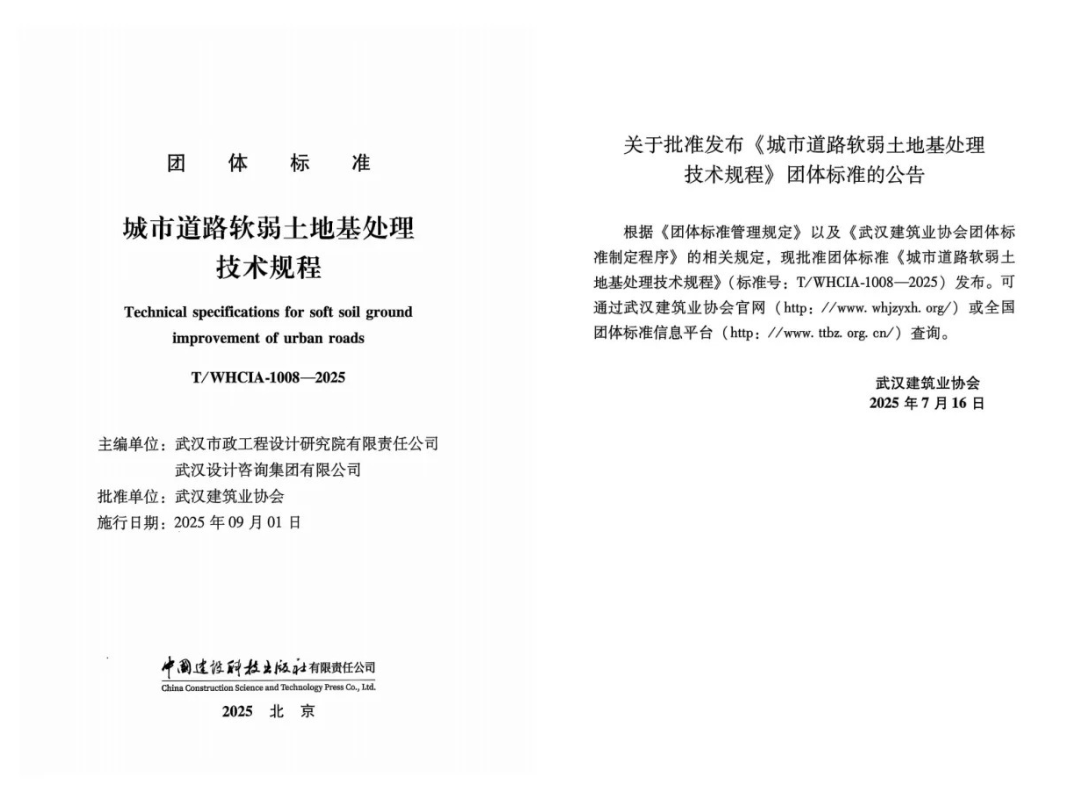 武漢市政院與武漢設(shè)計(jì)咨詢集團(tuán)聯(lián)合主編的團(tuán)體標(biāo)準(zhǔn)《城市道路軟弱土地基處理技術(shù)規(guī)程》,已由武漢建筑業(yè)協(xié)會(huì)批準(zhǔn)發(fā)布。該規(guī)程是國(guó)內(nèi)首部專門針對(duì)城市道路軟弱土地基處理的技術(shù)標(biāo)準(zhǔn),有效解決了現(xiàn)行建筑與公路規(guī)范在市政道路工程中存在的諸多不明確、不統(tǒng)一的應(yīng)用問題。其內(nèi)容系統(tǒng)全面,兼具實(shí)用性與先進(jìn)性,既體現(xiàn)了市政行業(yè)特色,又契合城市道路實(shí)際建設(shè)需求,對(duì)湖北省內(nèi)城市道路軟弱土地基處理的設(shè)計(jì)、施工、關(guān)鍵技術(shù)方法及檢測(cè)監(jiān)測(cè)等方面提供了權(quán)威依據(jù)與科學(xué)指導(dǎo)。該《規(guī)程》整體達(dá)到國(guó)內(nèi)先進(jìn)水平,在行業(yè)與省內(nèi)居于領(lǐng)先地位。它的發(fā)布進(jìn)一步鞏固了武漢市政院在市政巖土工程領(lǐng)域的技術(shù)優(yōu)勢(shì),顯著提升了公司的行業(yè)影響力與核心競(jìng)爭(zhēng)力。