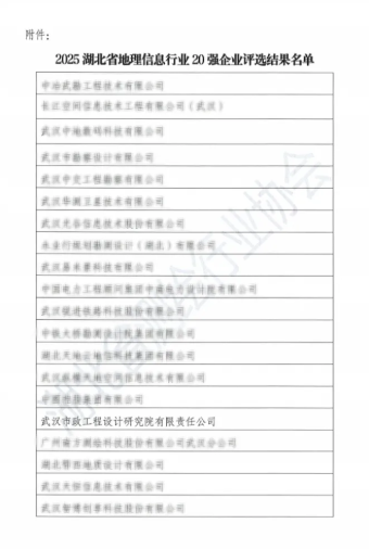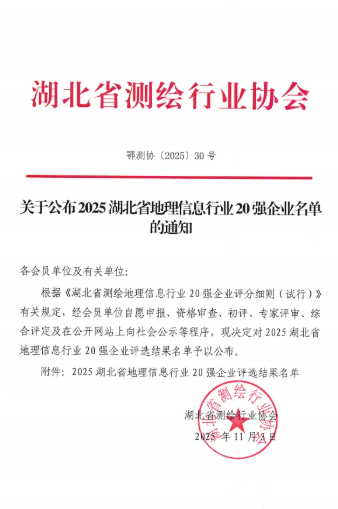近日,從湖北省測繪行業(yè)協(xié)會(huì)傳來喜訊,武漢市政院憑借卓越的技術(shù)實(shí)力與行業(yè)貢獻(xiàn),成功獲評“2025湖北省地理信息行業(yè)20強(qiáng)”。這一榮譽(yù)標(biāo)志著公司在測繪地理信息領(lǐng)域的專業(yè)能力獲得省級權(quán)威認(rèn)可,為企業(yè)發(fā)展里程碑再添濃墨重彩。