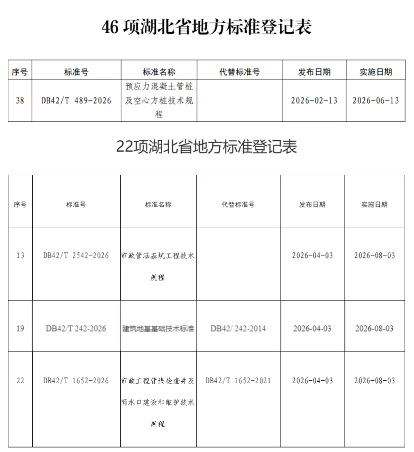 近日,由湖北省市場監(jiān)督管理局正式批準,公司主編的《市政管涵基坑工程技術規(guī)程》(DB42/T 2542-2026)、《市政工程管線檢查井及雨水口建設和維護技術規(guī)程》(DB42/T 1652-2026),以及參編的《建筑地基基礎技術標準》(DB42/T 242-2026)、《預應力混凝土管樁及空心方樁技術規(guī)程》(DB42/T 489-2026)正式發(fā)布,為湖北省及武漢市工程建設提供權威、科學、先進的技術指導。