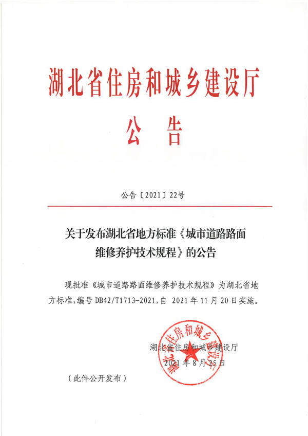 由我公司牽頭起草的湖北省地方標準《城市道路路面維修養(yǎng)護技術規(guī)程》(編號:DB42/T 1713-2021)于2021年7月20日由湖北省住房和城鄉(xiāng)建設廳、湖北省市場監(jiān)督管理局聯合發(fā)布,并于2021年11月20日起實施。