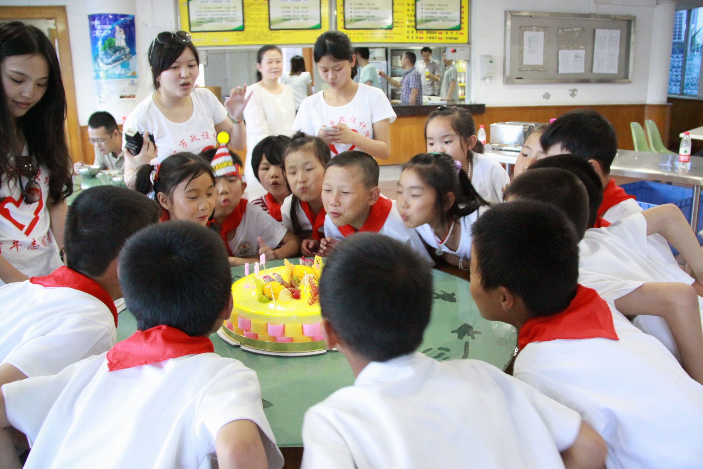 ??? 結(jié)束了一天的行程,志愿者與孩子們回到公司吃晚飯,孩子們有秩序的排隊(duì)領(lǐng)取晚餐,吃的干干凈凈。這時(shí),志愿者們端出了準(zhǔn)備好的蛋糕,為這群7-9歲的孩子們過一個(gè)集體生日,大家唱著生日歌,一起吹滅了蠟燭。志愿者們將蛋糕分發(fā)給每一個(gè)孩子,他們吃的津津有味。