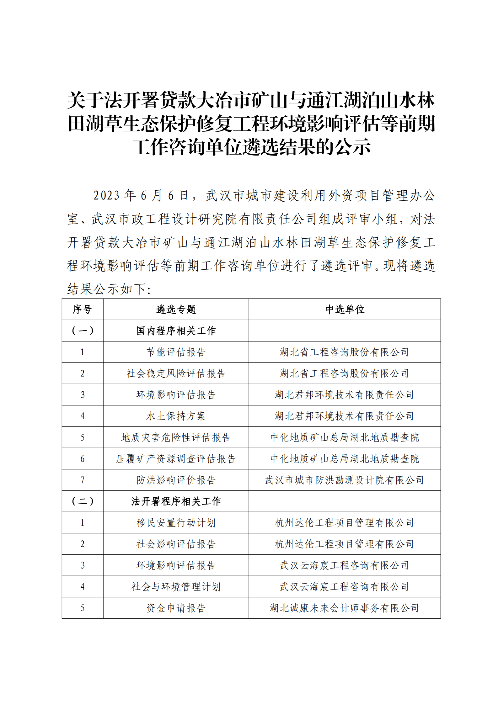 關(guān)于法開署貸款大冶市礦山與通江湖泊山水林田湖草生態(tài)保護(hù)修復(fù)工程環(huán)境影響評估等前期工作咨詢單位遴選結(jié)果的公示